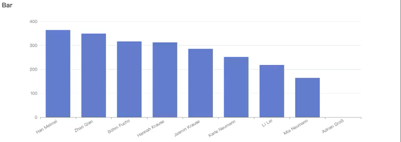 const dataset = { dimensions: ['name', 'score'], source: [ ['Hannah Krause', 314], ['Zhao Qian', 351], ['Jasmin Krause ', 287], ['Li Lei', 219], ['Karle Neumann', 253], ['Mia Neumann', 165], ['Böhm Fuchs', 318], ['Han Meimei', 366] ] }; const pieOption = { dataset: [dataset], series: [ { type: 'pie', // associate the series to be animated by id id: 'Score', radius: [0, '50%'], universalTransition: true, animationDurationUpdate: 1000 } ] }; const barOption = { dataset: [dataset], xAxis: { type: 'category' }, yAxis: {}, series: [ { type: 'bar', // associate the series to be animated by id id: 'Score', // Each data will have a different color colorBy: 'data', encode: { x: 'name', y: 'score' }, universalTransition: true, animationDurationUpdate: 1000 } ] }; option = barOption; setInterval(() => { option = option === pieOption ? barOption : pieOption; // Use the notMerge form to remove the axes myChart.setOption(option, true); }, 2000);